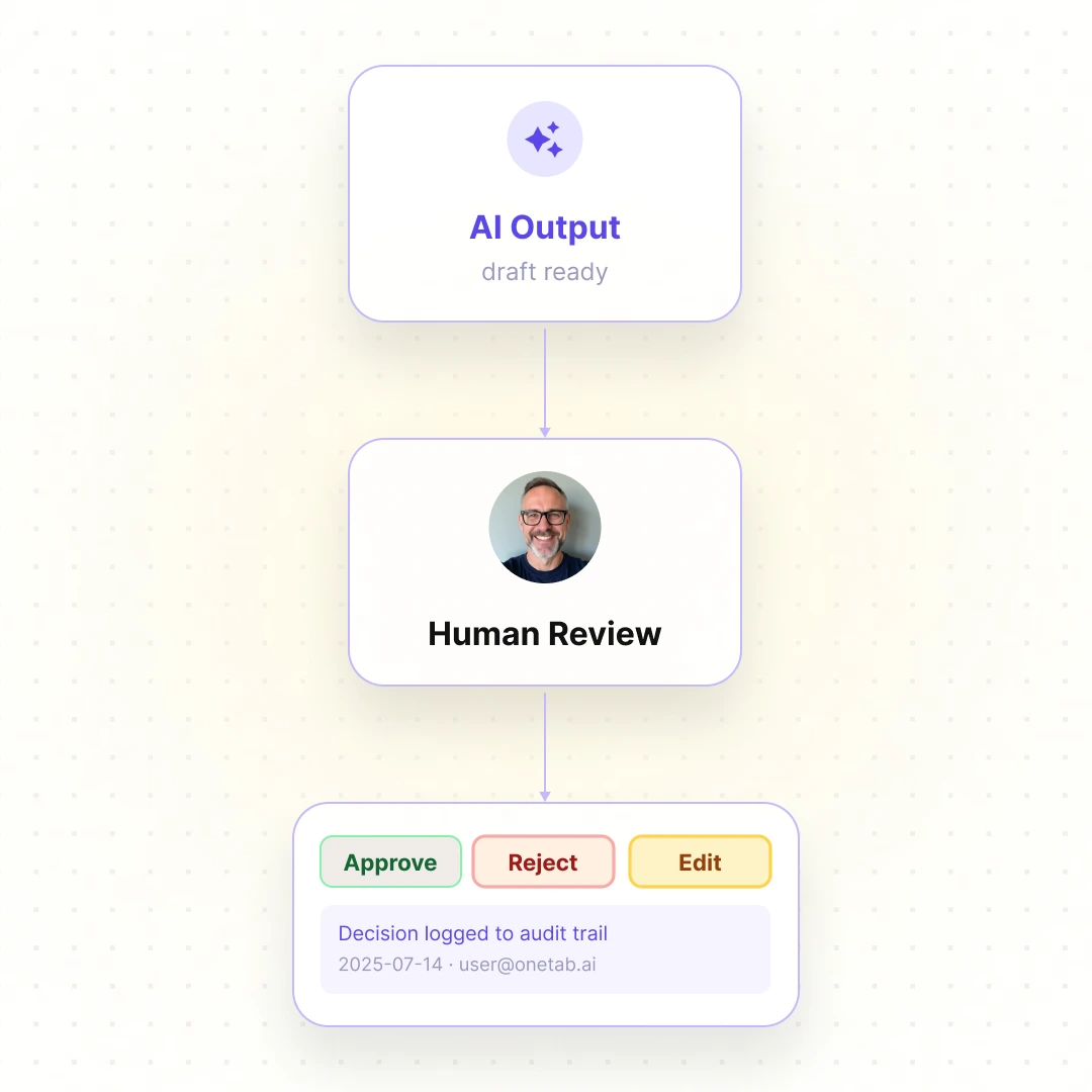 Autopilot is risky. Onetab puts "Human-in-the-Loop" checkpoints exactly where you need them. Approve, reject, or edit AI outputs before they ever reach a customer.