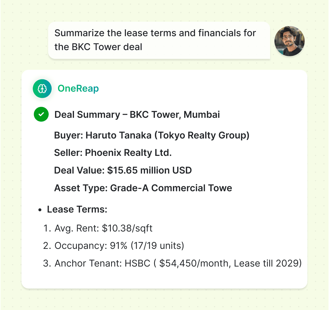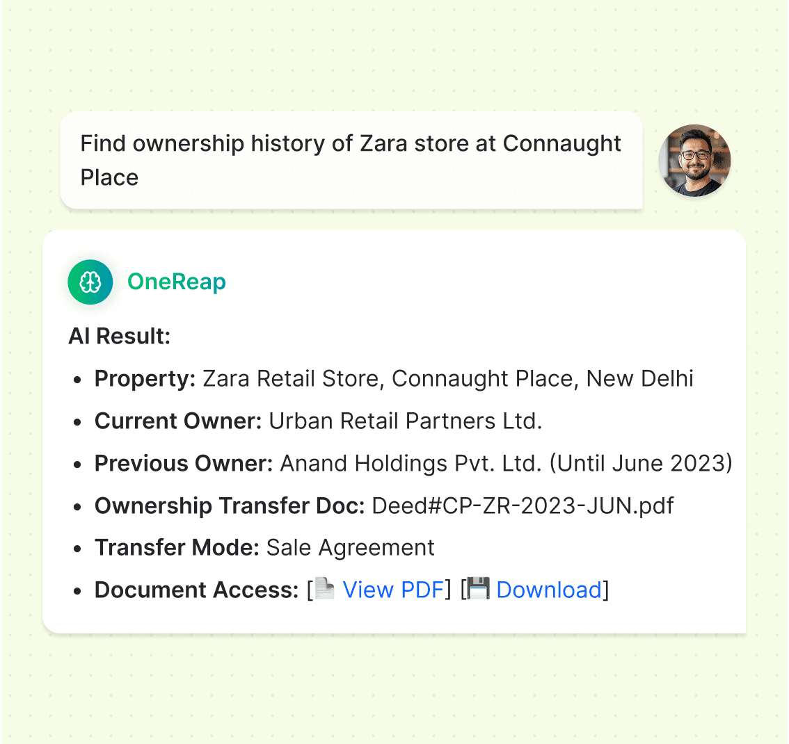 Use hybrid AI search to find listings, ownership details, or deal docs — ranked by context and role.