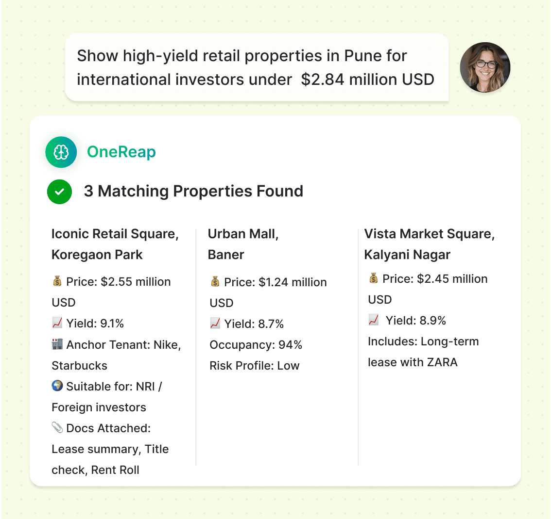 Use AI to align listings with buyer or investor criteria — by price, location, yield, or risk profile.